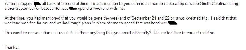 I wrote previously about the STBX’s recent decision to prohibit me from seeing The Boy until there is a separation agreement in place. A few days afterward, I realized that I needed to have her admit, in writing, what she was doing. Here is a snippet of said e-mail from me: