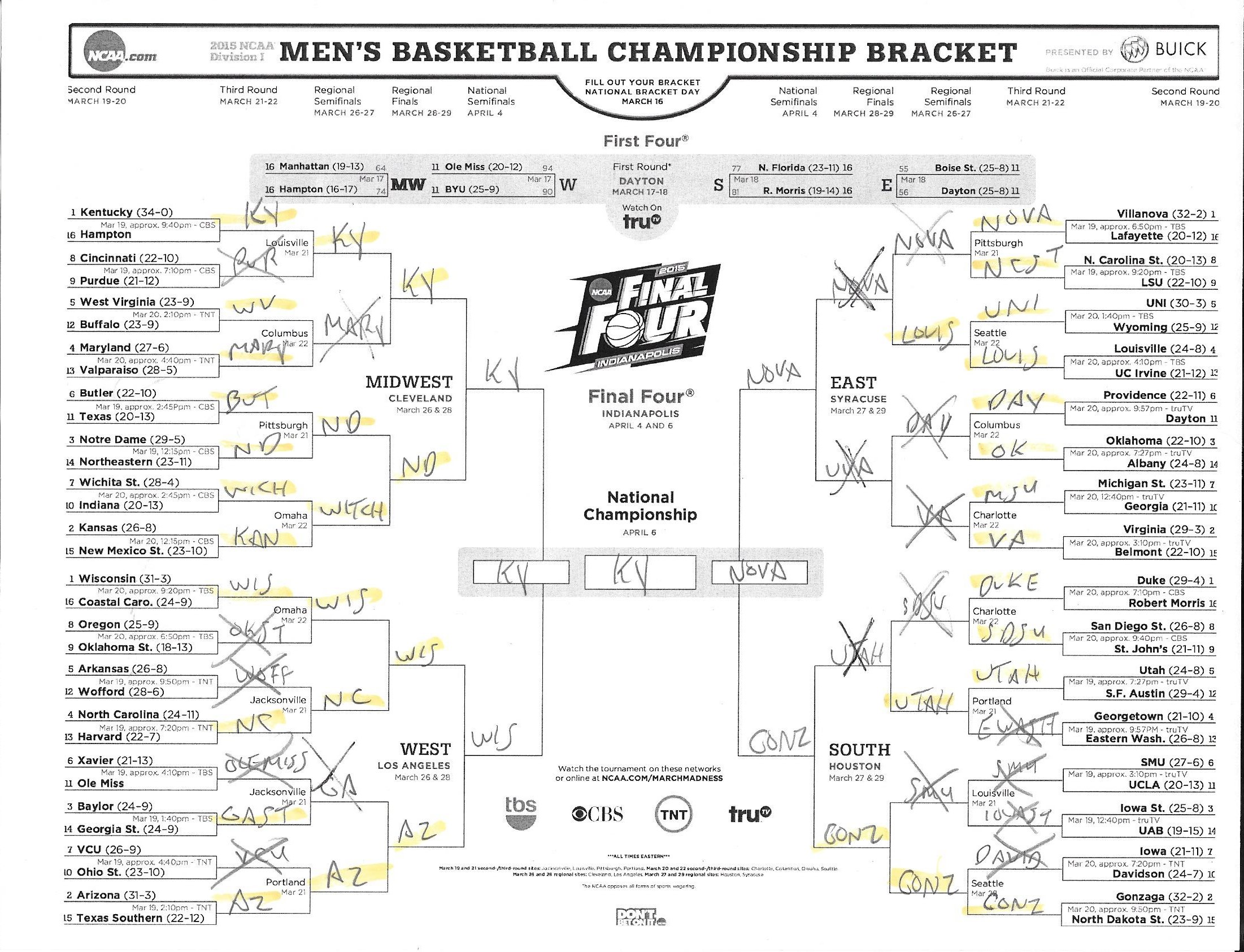 UPDATE 3.29.15: 5th round 2/4. 50%. One side of my bracket is now completely shot. On the other hand, I did successfully predict the elite 8 and final four teams from the regions. Maybe I’ll even try one of those online challenges next year.
