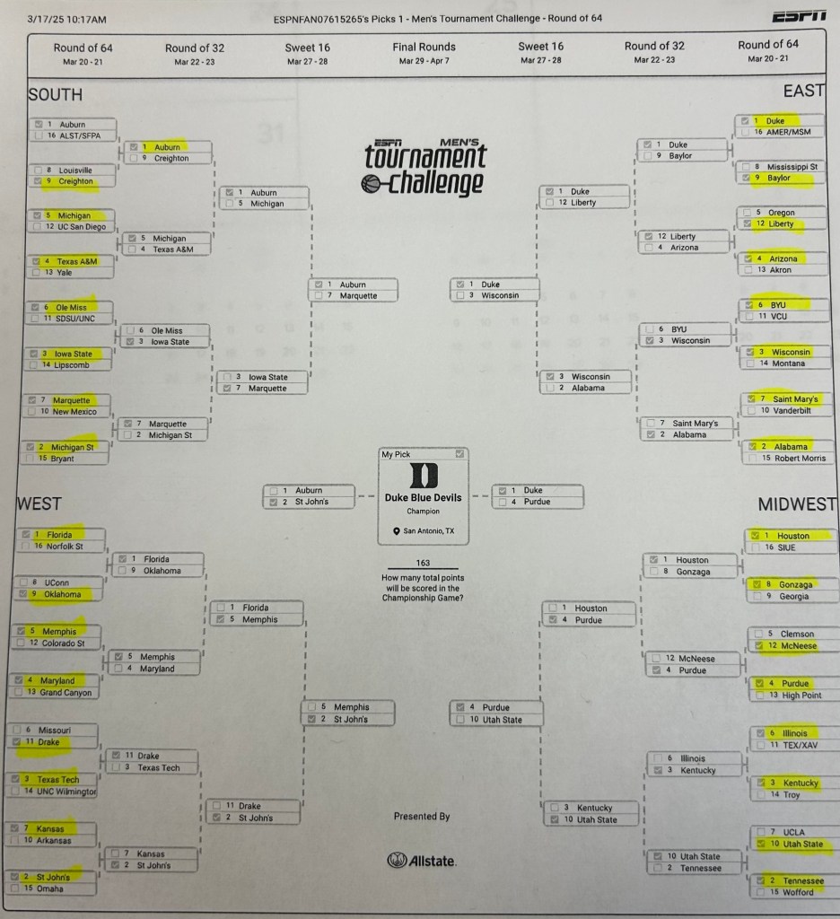 If you haven’t already, go online, do a Google search for “march madness 2025 bracket”. Print one off. Make your pics. Have fun with it! If you went to college, maybe you wanna cheer for your school, or school from your state. Maybe you like a team’s nickname or their logo. Or their uniforms. Maybe you just want to pick all the underdogs. it’s up to you. Chances are, you’ll pick just as well as the analyst do. Maybe you’ll even do a little bit better.