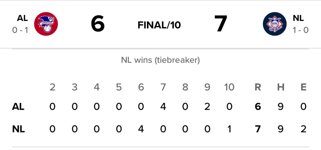 It will be interesting to see and these and weeks ahead how MLB addresses the situation with last night‘s game. Will the home run Derby be the ongoing tiebreaker going forward? Or was it a last-minute decision simply to wrap the game up as quickly as possible, as the time was well past 11 PM Eastern before the game ended.