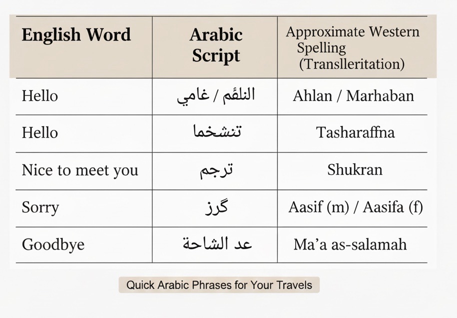 In keeping with today’s prompt, here are five essential words and phrases, their Arabic translations, and the approximate Western spelling, which I generated with the help of Google Gemini: