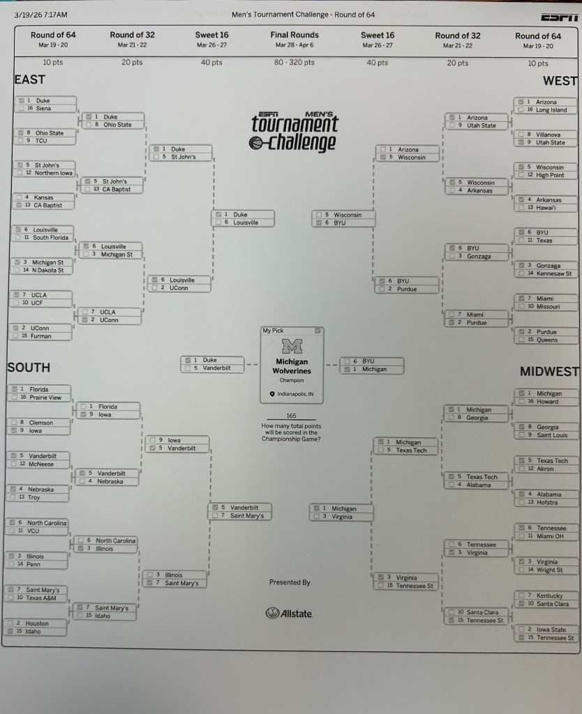 - Loyalty vs. Logic: I’ve got the Wolverines winning it all despite my newfound Badger loyalty. Does anyone else struggle with picking against their own family’s school in the name of a “perfect” bracket?